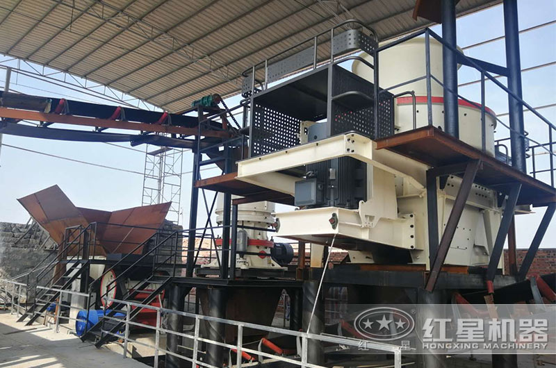 制砂:鄂破+圆锥破碎机+冲击式破碎机+给料机+筛分设备+皮带输送机